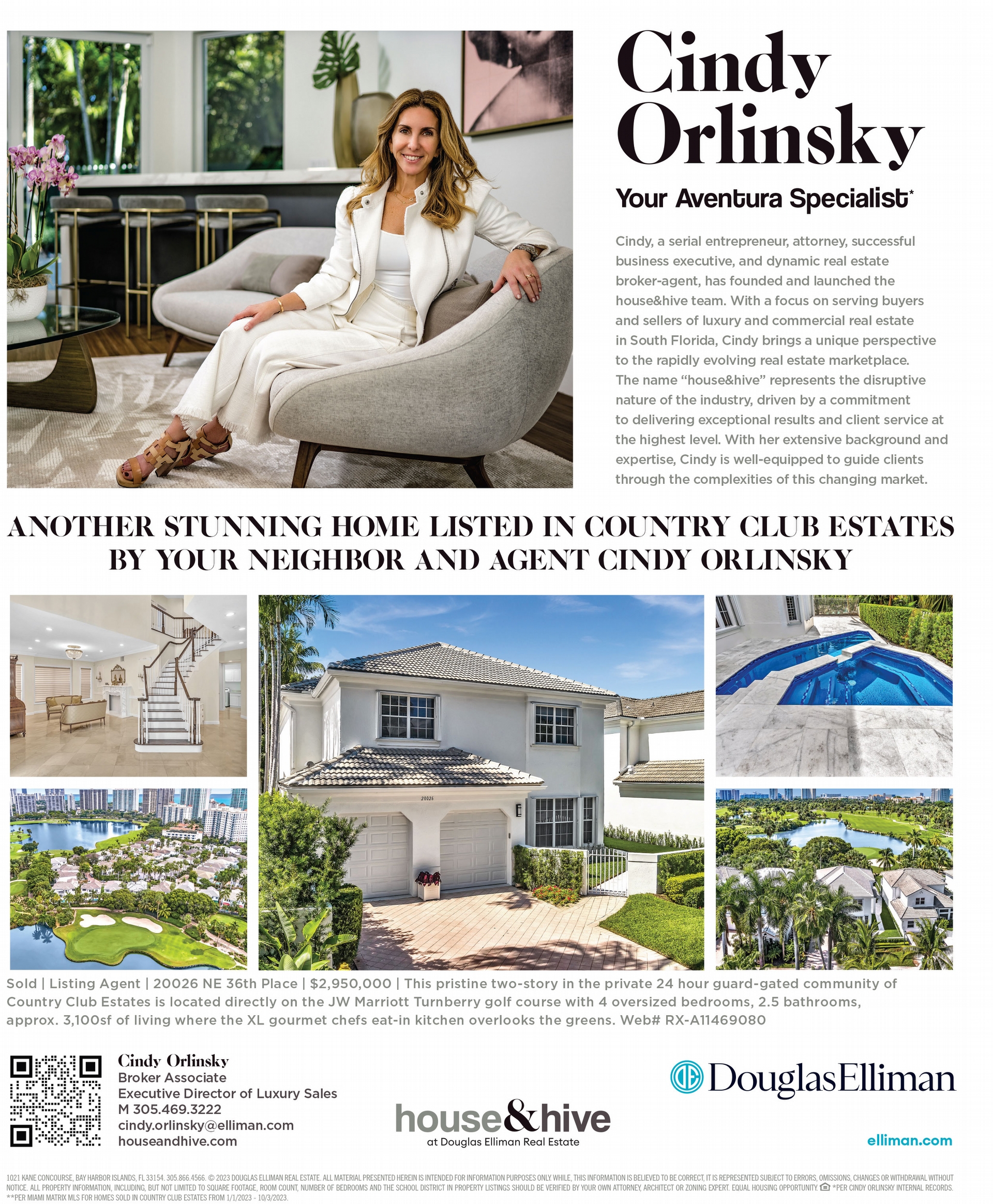 © 2023 Douglas Elliman Real Estate. All material presented herein is intended for information purposes only. While this information is believed to be correct, it is represented subject to errors, omissions, changes or withdrawal without notice. All property information, including, but not limited to square footage, room count, number of bedrooms and the school district in property listings should be verified by your own attorney, architect or zoning expert. Equal Housing Opportunity. *Per Cindy Orlinsky internal records. **Per Miami Matrix MLS for homes sold in Country Club Estates from 1/1/2023 - 10/3/2023.